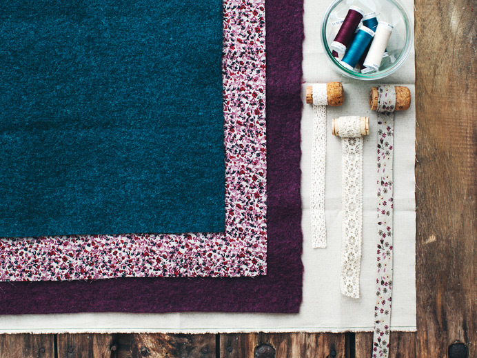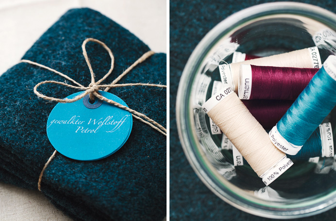 In dem DIY-Schleifen-Bastelset findet Ihr alles, was Ihr zum Basteln braucht und nicht zu Hause habt: 4 verschiedene, hochwertige Stoffe in ca. 50 cm x 50 cm (einen petrolfarbenen gewalkten Wollstoff, einen Leinenstoff, einen gefilzten Wollstoff in Fuchsia und einen bordeauxfarbenen geblümten Baumwollstoff) mit Wasch- und Pflegehinweisen, 3 farblich passende Garne und drei verschiedene Bänder (Häkelband, Spitzenband, Stoffband).
